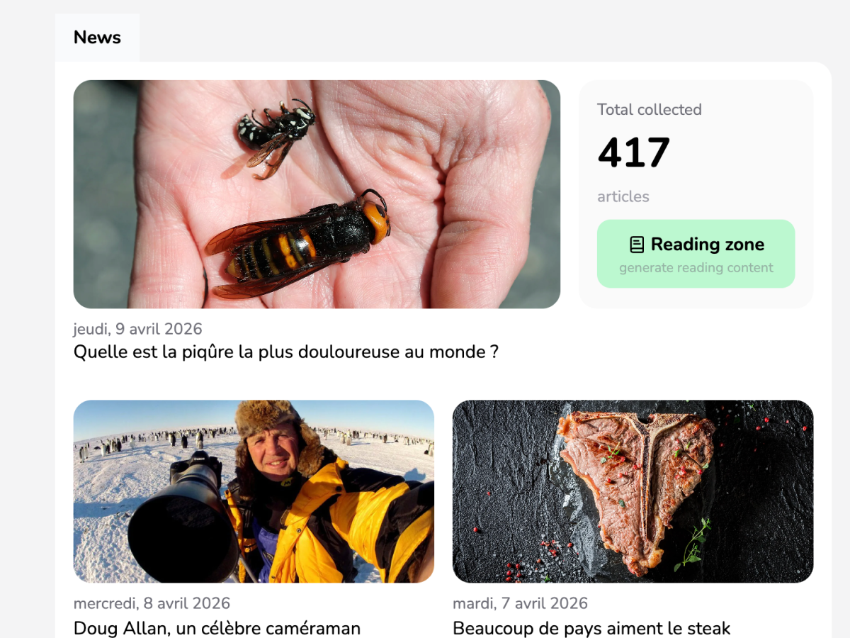 Curated French news articles updated daily across different difficulty levels to improve reading skills.